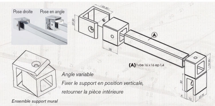 Barre de stabilisation pour paroi de douche de 6 à  10mm d'épaisseur. Réglable et orientable, recoupe facile, finition parfaite, tube carré. Ligne moderne et épurée. Très simple à  poser. Pose en angle ou droite. Kit comprenant la barre (à  recouper selon besoin) + support mural pivotant + pince réglable pour verre + 2 embouts + accessoires de montage (clefs 6 pans, vis, cheville...). Existe aussi avec barre de 2m65. Matià¨re aluminium. Existe en chromé brillant, Noir mat velours, Blanc 9016 satiné, Inox brossé, Laiton brossé, Mat velours