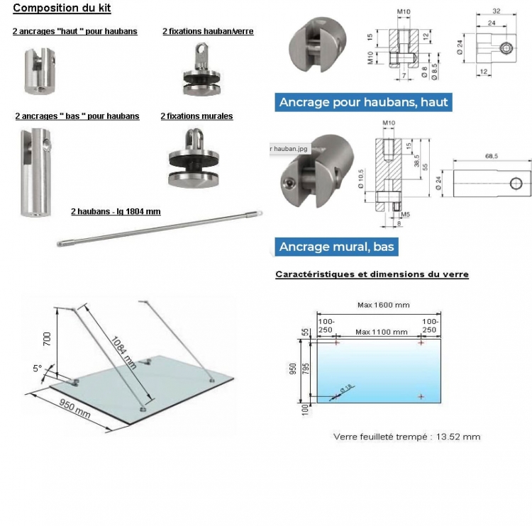 La fixation de la marquise LOUNA 2 haubans est réalisé par des points de fixation de diamètre 50 mm, en inox 304 ou inox 316L, ancrage mural filetage M10.