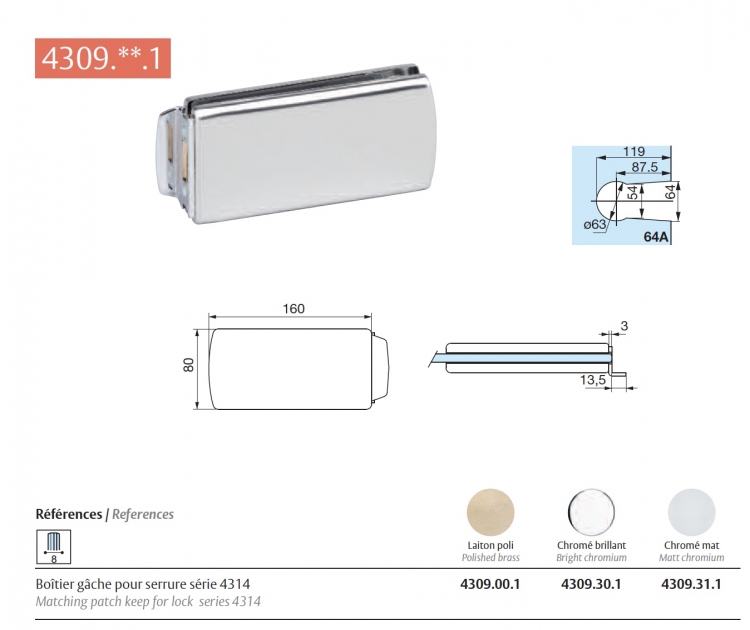 Boitier gâche pour serrure série 4300 doré brillant. Avec encoche 64A du verre sécurit 8mm. Pour porte Clarit